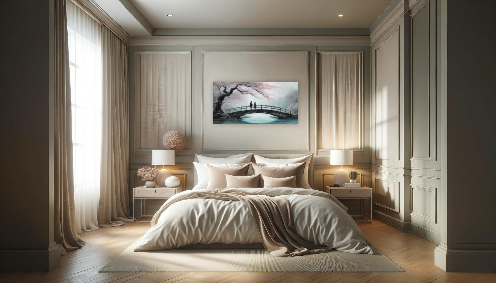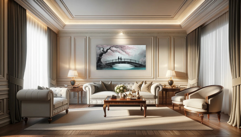 Tauche ein in die Harmonie dieser malerischen Szene, die zwei Personen zeigt, die gemeinsam einen Moment der Ruhe auf einer geschwungenen Brücke genießen. Umgeben von zartrosa Kirschblüten und einem altehrwürdigen Baum, der die Zeit zu bezeugen scheint, ist dieses Kunstwerk ein Zeugnis stiller Verbundenheit und zeitloser Schönheit. Lass dich verzaubern von der friedvollen Ausstrahlung dieses einzigartigen Kunstwerkes, welches eine Oase der Besinnlichkeit in deinem Raum schafft.