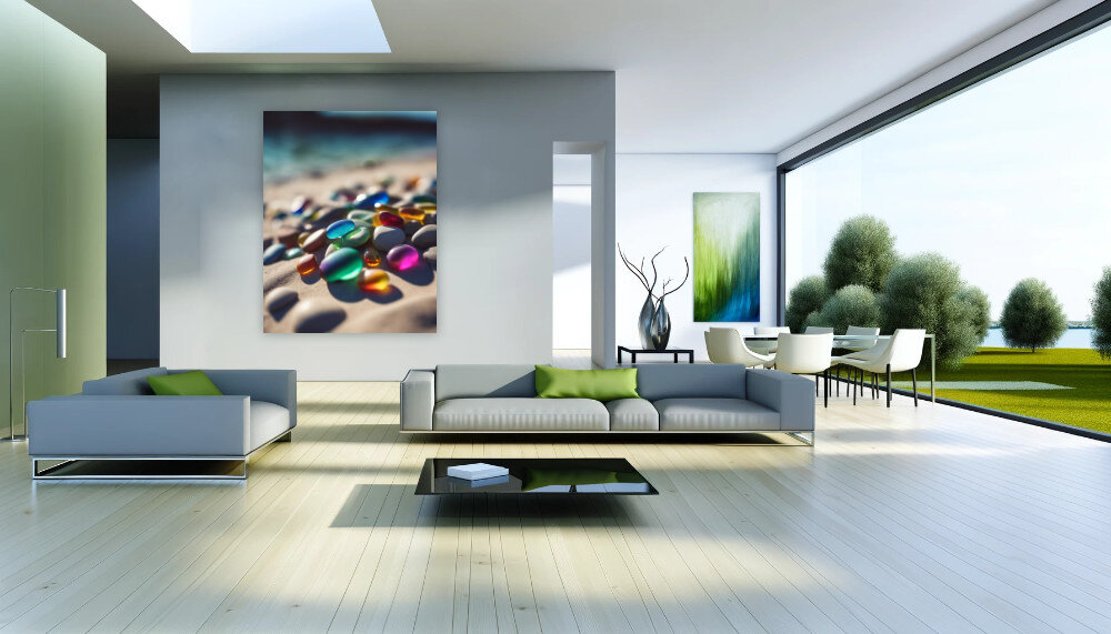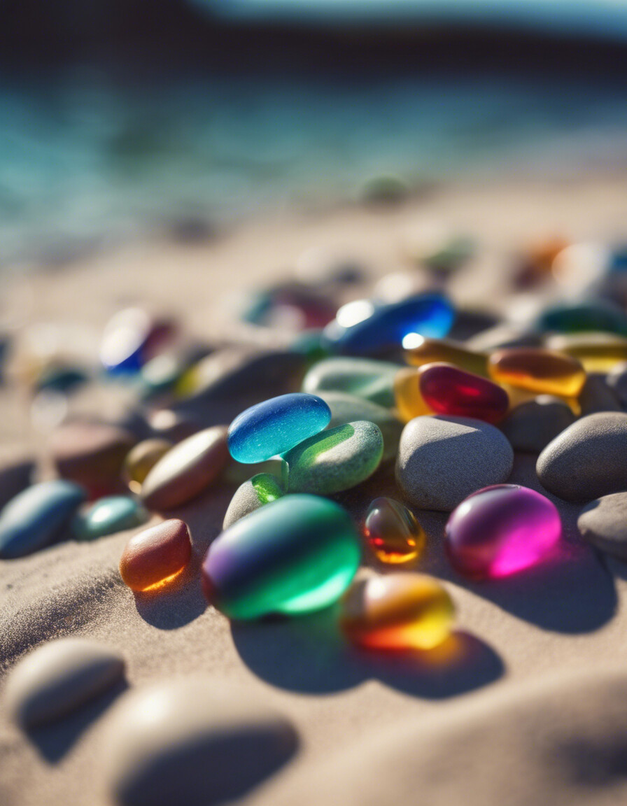 Tauche ein in das faszinierende Farbenspiel dieser Glaskiesel, künstlerisch eingefangen in sanftem Sonnenlicht. Das Bild zeigt eine bunte Sammlung von geschliffenen Glasperlen, die sorgfältig auf einem Strand arrangiert sind. Die verschiedenen Farben und Formen der Kiesel fangen das Licht auf einzigartige Weise ein und kreieren einen lebendigen, fast märchenhaften Eindruck, der die Betrachterin oder den Betrachter in eine Welt voller Farbe und Glanz entführt. Diese Komposition aus Farbe und Licht vermittelt Ruhe und Harmonie und ist als hochwertiger Druck für Wohn- oder Arbeitsräume hervorragend geeignet.