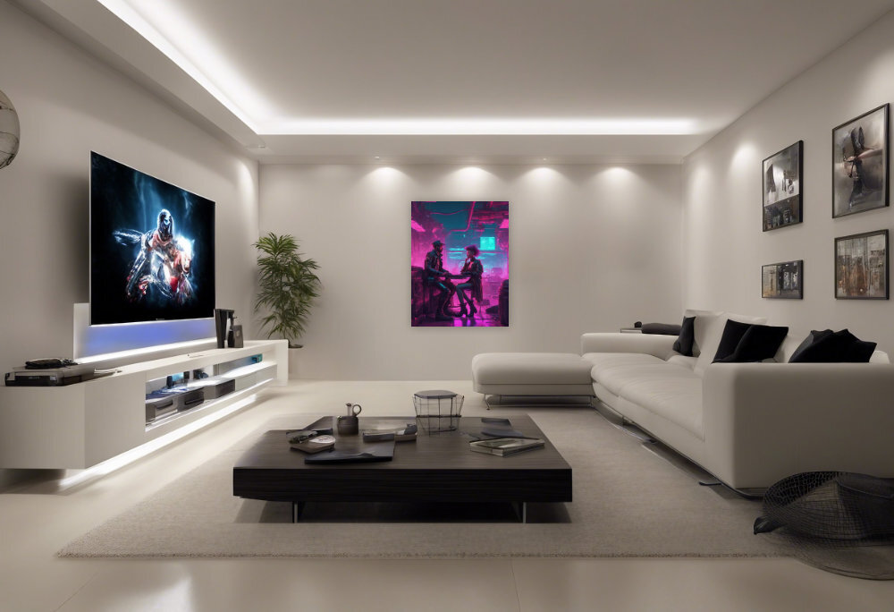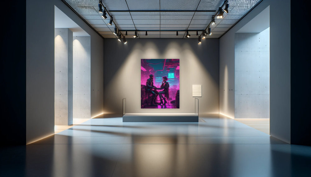Tauche ein in die faszinierende Welt der Cyberpunk-Begegnung, festgehalten in diesem einzigartigen Kunstwerk. Zwei Charaktere, sitzend an einem Tisch, teilen einen Moment inmitten des lebendigen Neonlichts einer futuristischen Stadt. Die umgebenden Elemente des Bildes, wie verschlungene Rohrleitungen und schimmernde Interfaces, suggerieren eine Geschichte von Technologie und Menschlichkeit. Dieses Kunstwerk ist ein Blickfang für jede Wand und lädt zum Träumen von nahen Zukünften ein.