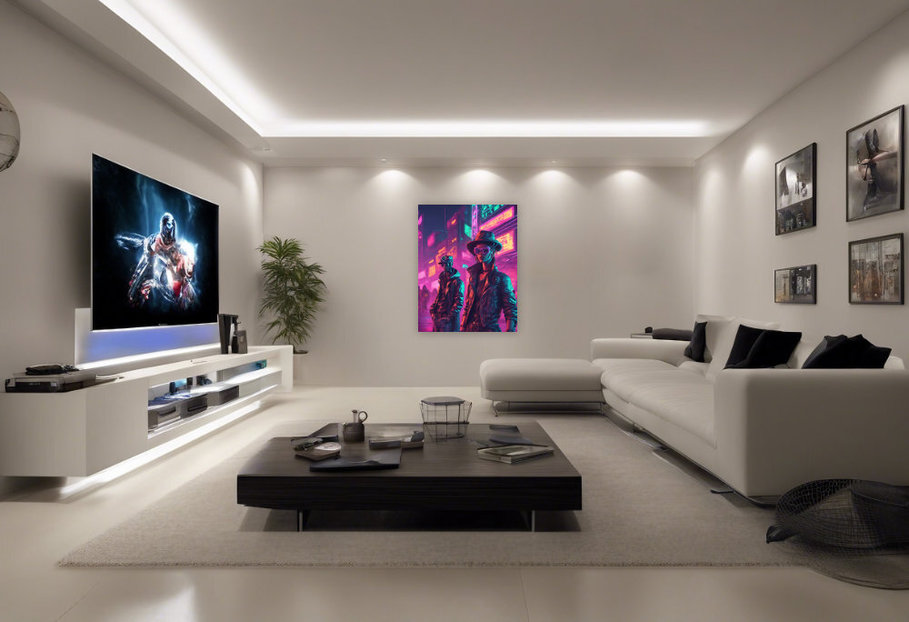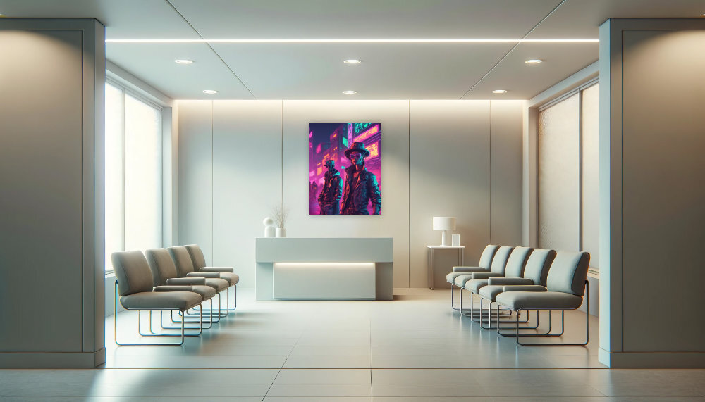 Tauche ein in die pulsierende Welt des Cyberpunks mit diesem eindrucksvollen Kunstwerk. Zwei stilvolle Figuren, ausgestattet mit futuristischer Mode und Technologie, stehen im Vordergrund, während sie von einem Meer aus grellen Neonlichtern und Werbetafeln umgeben sind. Die lebendige Szenerie, die an dystopische Science-Fiction erinnert, ist der perfekte Blickfang für dein Zuhause oder Büro. Lass dich von den leuchtenden Farben und der geheimnisvollen Atmosphäre dieses Kunstwerks verzaubern und bring einen Hauch von futuristischem Flair in deine Umgebung.
