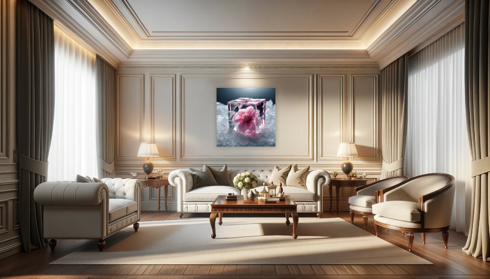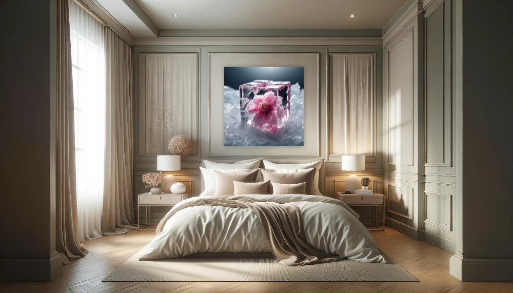 Diese kunstvolle Darstellung einer zarten Blüte, eingefroren in Zeit und Eis, fängt die Schönheit des Vergänglichen ein. Die Balance zwischen der kühlen Transparenz des Eises und der warmen Zartheit der Blütenblätter schafft ein faszinierendes Kontrastspiel, das die Natur in einem unwirklichen, fast magischen Zustand zeigt. Ein Kunstwerk, das zur Reflexion anregt und durch seine Detailtiefe und das spannende Zusammenspiel von Farben und Formen beeindruckt. Ideal für moderne Räumlichkeiten, die eine Note von Eleganz und Einzigartigkeit suchen.