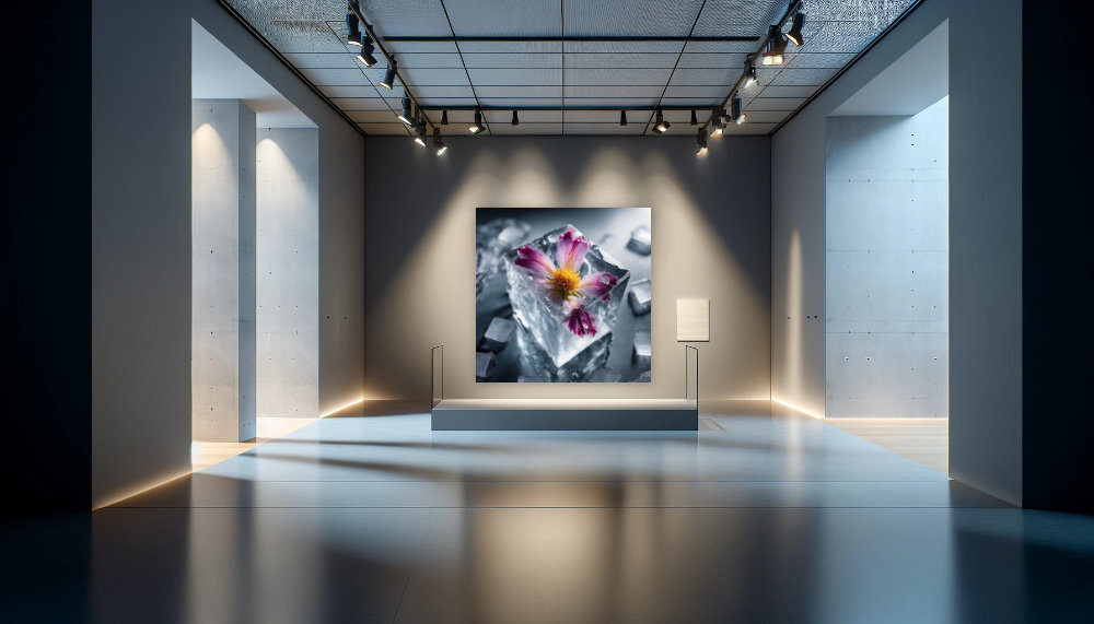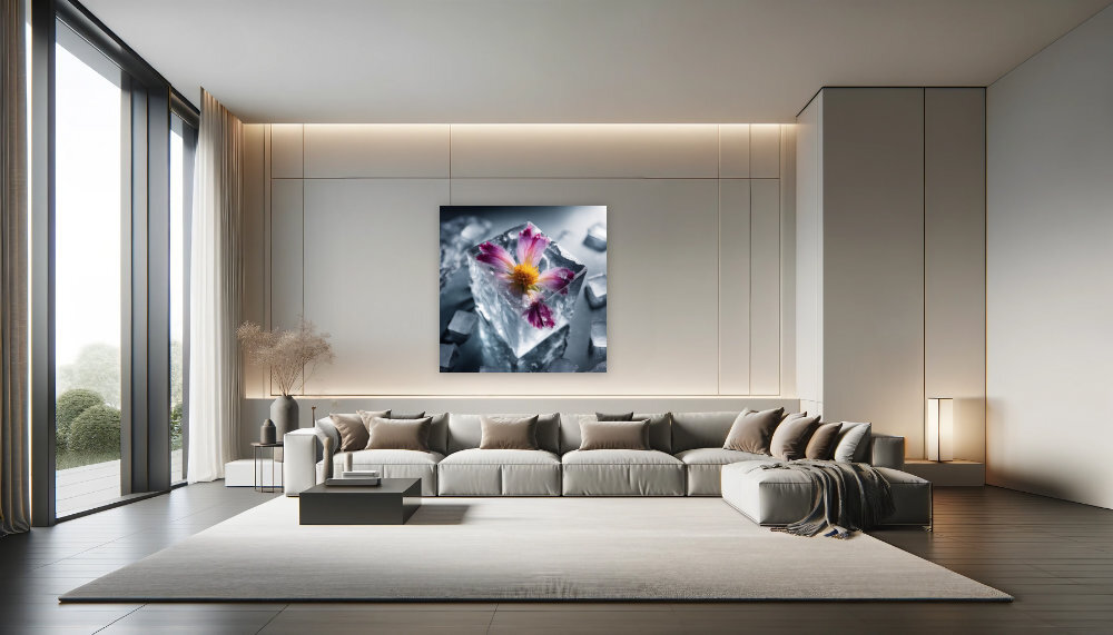 Diese faszinierende Komposition fängt die Schönheit einer zarten Blüte ein, die kunstvoll in einem Eiswürfel konserviert wurde. Der Kontrast zwischen der vergänglichen Blumenpracht und der kühlen, kristallinen Struktur des Eises spricht Bände über das Zusammenspiel von Natur und Zeit. Diese Darstellung, perfekt für jeden Raum, der einen Hauch von Eleganz und Einzigartigkeit benötigt, ist ein wahrer Blickfang.