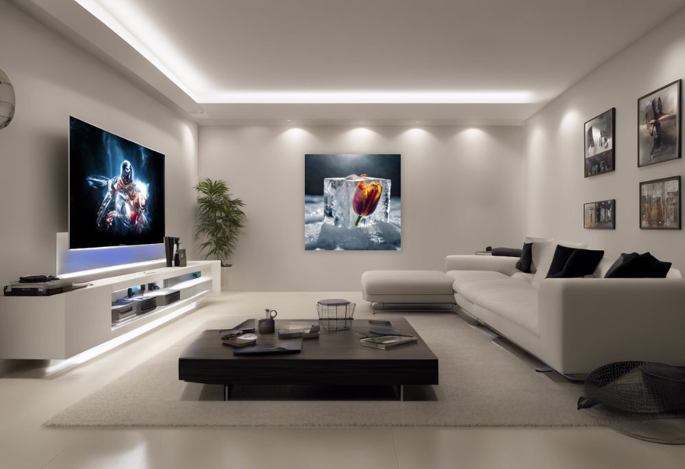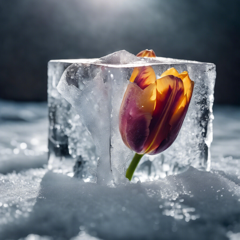 Diese beeindruckende Darstellung einer Tulpe, eingebettet in glitzerndes Eis, fängt die Schönheit des Frühlings trotzend gegen die winterliche Kälte ein. Die leuchtenden Farben der Blüte stehen im starken Kontrast zu dem klaren Eis und dem sanften Schneebett, was ein faszinierendes Spannungsfeld erzeugt. Perfekt für jene, die nach einem Kunstwerk suchen, das die Stärke und Zerbrechlichkeit der Natur symbolisiert, und die Harmonie von Kontrasten feiert.