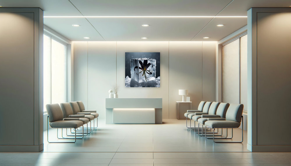 Diese Komposition zeigt eine atemberaubende Blume, festgehalten zwischen gefrorenen Eisblöcken. Das Bild fängt das Spiel zwischen dem zarten Naturwunder und der Kraft der Kälte ein. Die dynamische Spannung und die kontrastreichen Farben machen dieses Kunstwerk zu einem eindrucksvollen Eyecatcher für dein Zuhause oder Büro.