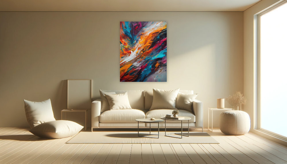 Diese dynamische Komposition ist ein Fest für das Auge, in dem lebhafte Farben in einer organischen, fließenden Bewegung verschmelzen, die an einen Wirbelsturm aus Farbe erinnert. Die vielschichtigen Töne schaffen eine abstrakte Szenerie, die Raum für persönliche Interpretation und geistige Ausflüge bietet. Ein echtes Highlight für jede moderne Raumgestaltung, das die Blicke auf sich zieht und zum Gesprächsstoff wird. Die hohe Qualität des Drucks bringt jedes Detail und jede Nuance dieser fesselnden Kunst zum Strahlen.
