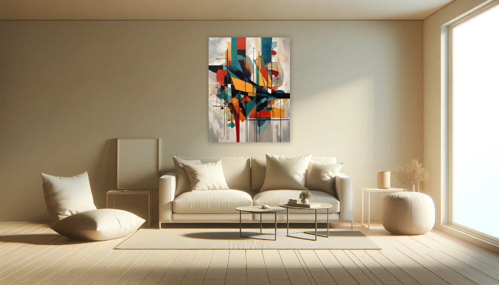 Dieses ausdrucksstarke Kunstwerk ist eine perfekte Symbiose aus lebendigen Farben und scharfen geometrischen Formen. Durch die gekonnte Vermischung von Strukturen und Farbnuancen entsteht eine dynamische Komposition, die sowohl Eleganz als auch einen Hauch von Modernität in jeden Raum bringt. Die Kombination aus abstrakten Elementen und den fließenden Übergängen erschafft eine visuelle Spannung, die die Betrachterinnen und Betrachter zum Träumen und Interpretieren einlädt.
