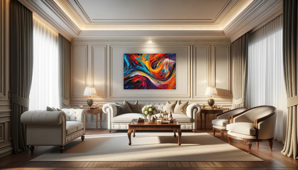 Diese dynamische Komposition strahlt eine energiegeladene Atmosphäre aus und bringt Leben in jeden Raum. Die lebhaften Pinselstriche in Blau, Rot, Gelb und weiteren Farben verschmelzen zu einem tiefgründigen Wirbel, der die Vorstellungskraft anregt und den Betrachter auf eine visuelle Reise mitnimmt. Perfekt für moderne Innenräume, die einen Hauch von Farbe und Kreativität benötigen.