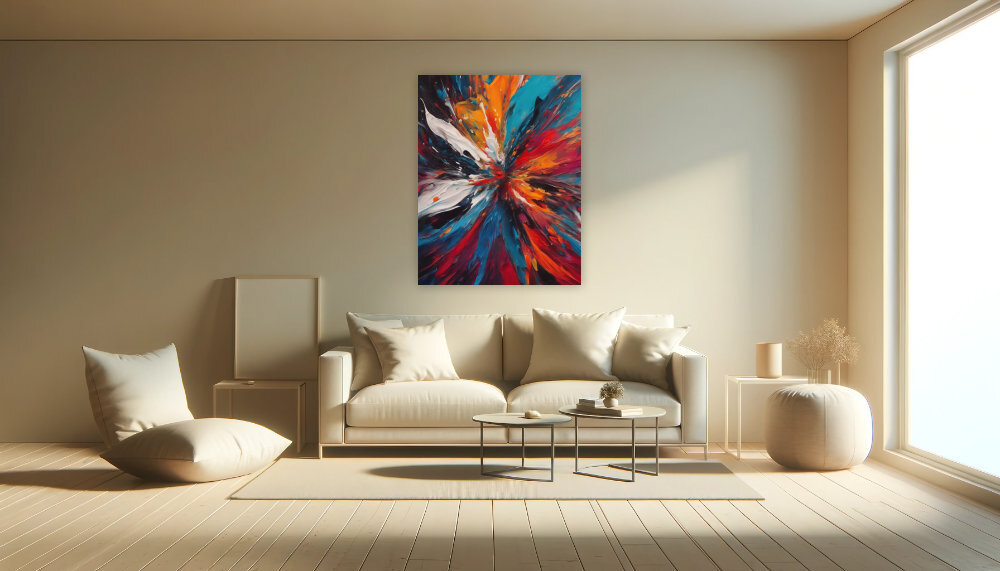 Tauche ein in das Herzstück eines Farbenfeuerwerks, das vor Vitalität und Energie strotzt. Dieses Kunstwerk fängt eine ungezähmte Explosion von Farben ein, die sich in alle Richtungen ausbreitet und eine scheinbar endlose Bewegung erschafft. Das Bild ist voller Leben und die satten, lebendigen Farben sind perfekt dazu geeignet, jedem Raum ein Gefühl von Dynamik und Freude zu verleihen.