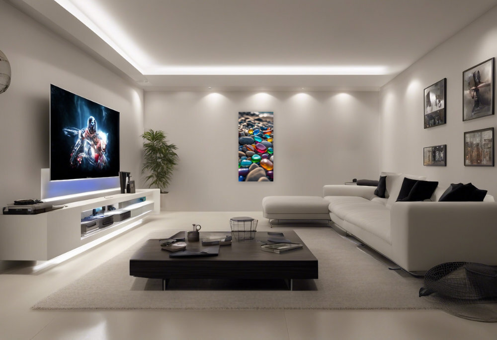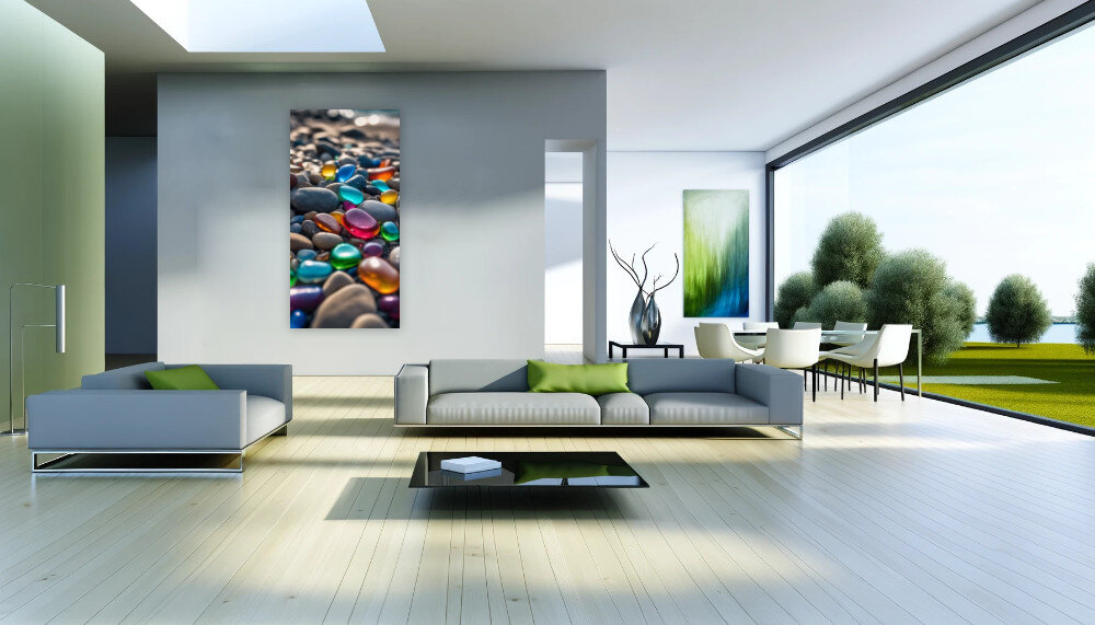 Ein faszinierendes Spiel von Licht und Farbe erweckt diese Komposition zum Leben. Farbige, glasige Objekte liegen verstreut zwischen grauen Kieselsteinen und reflektieren das Licht auf einzigartige Weise. Der Fokus auf die leuchtenden Reflexe erschafft ein Kunstwerk voller Tiefe und Brillanz. Die perfekte Wahl für einen Raum, der einen Hauch von Farbe und das besondere Etwas verlangt.
