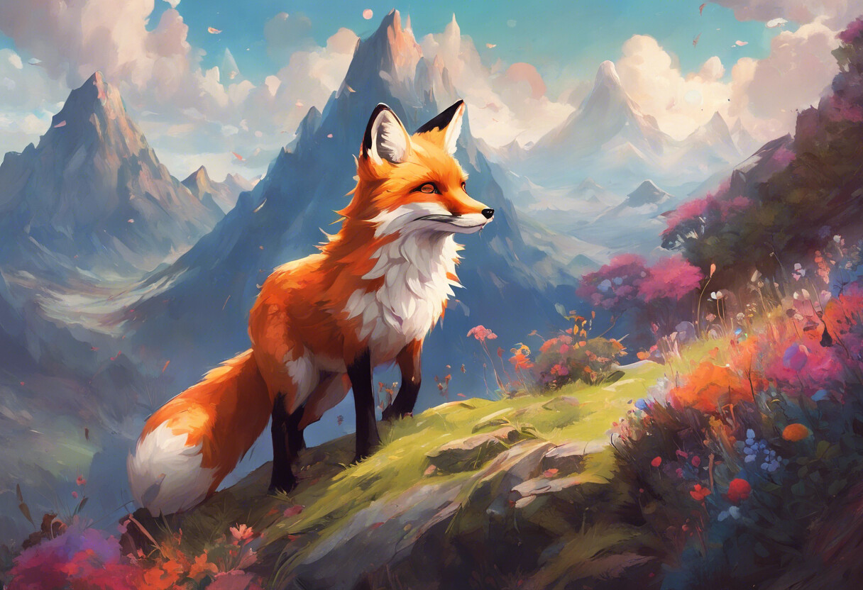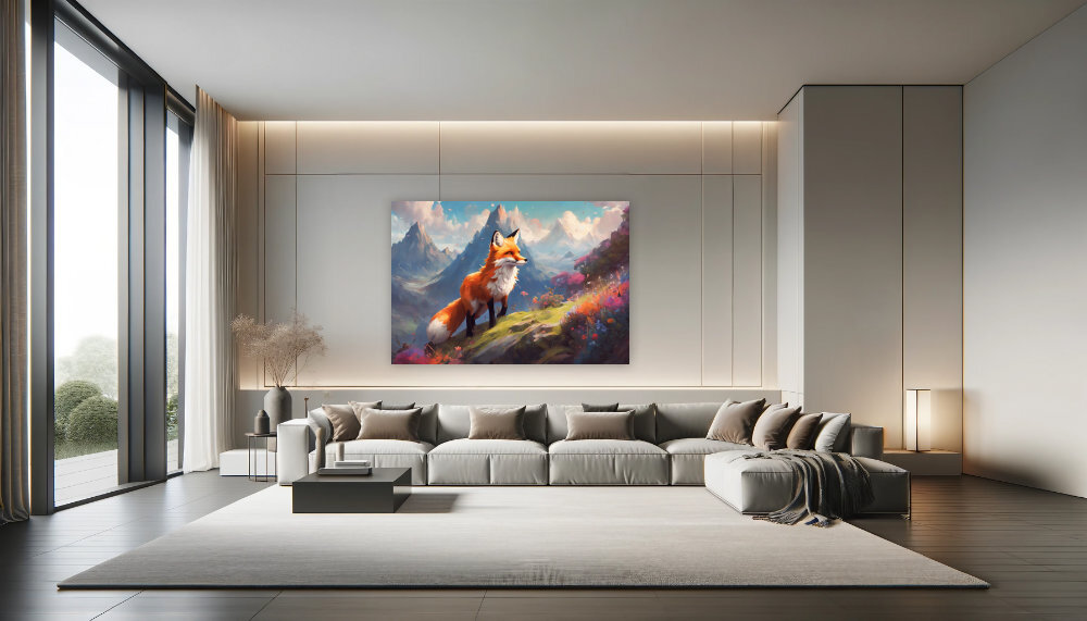 Ein majestätischer Fuchs steht auf einem blumigen Hügel, umgeben von einer atemberaubenden Berglandschaft. Der klare Himmel und die farbenfrohen Blumen schaffen eine idyllische und magische Atmosphäre. Diese KI-generierte Kunst fängt die Schönheit und den Frieden der Natur perfekt ein und bringt eine harmonische Szene in jeden Raum.