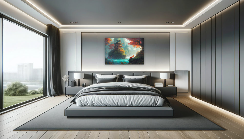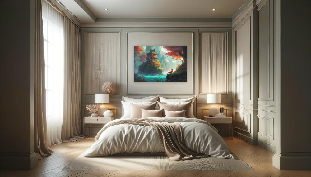 Tauche ein in die zauberhafte Welt dieser KI-generierten Kunst, die einen lebhaften Fuchs zeigt, der auf einem Felsen steht. Im Hintergrund erhebt sich ein traditionelles japanisches Gebäude umgeben von herbstlich gefärbten Bäumen und einem strahlend blauen Fluss. Dieses Bild vereint natürliche Schönheit mit architektonischer Eleganz und bringt eine friedvolle und mystische Atmosphäre in deine Räume.