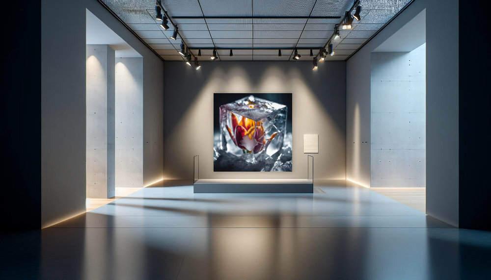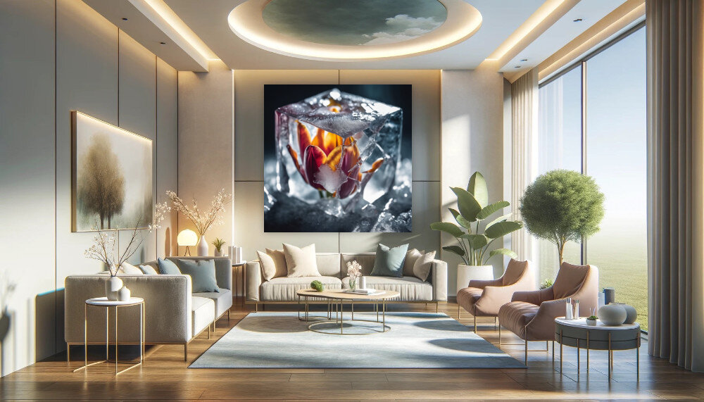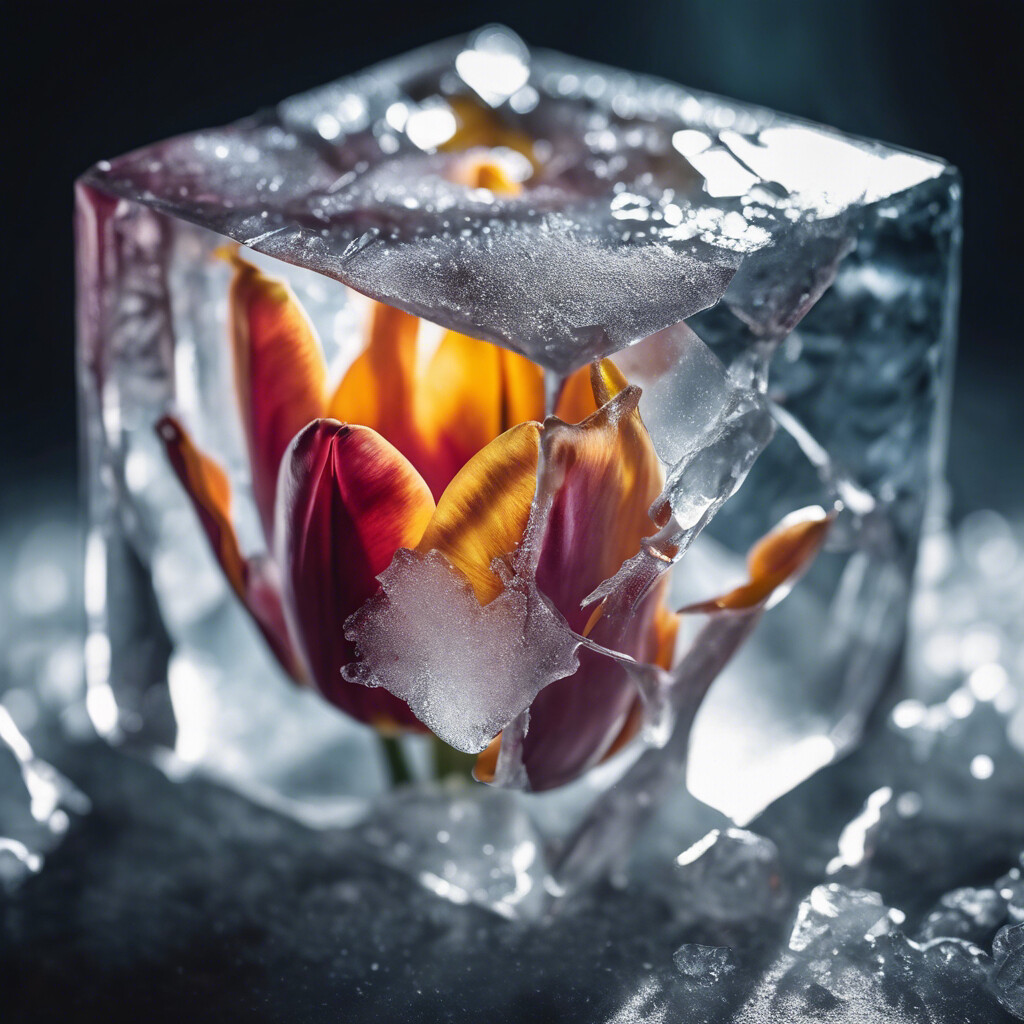 Diese Kunstwerkdarbietung zeigt eine zarte Blume, gefangen in einem klaren Eiswürfel, ein Spiel von Stärke und Fragilität. Die kräftigen Farben der Blütenblätter setzen sich dramatisch gegen das frostige Weiß und Transparent des Eises ab. Akkurate Lichtreflexe und scharfe Details schaffen ein visuelles Erlebnis, das die Schönheit des Vergänglichen und die Kraft der Natur eindrucksvoll vereint. Diese Komposition lässt sowohl Ruhe als auch eine stille Dynamik spüren und ist ein Blickfang für jede Raumgestaltung.