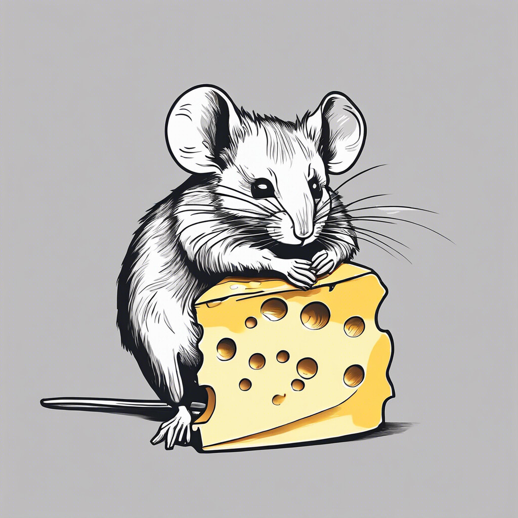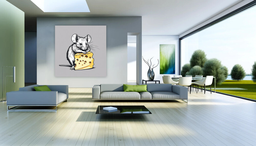 Diese entzückende Illustration zeigt eine Maus, die behaglich an einem großen Stück Käse knabbert. Die Detailtreue in der Darstellung des Fells und des Käses erzeugt ein Gefühl von Wärme und Komfort. Die dezente Farbgebung mit sanften Grautönen und dem kontrastreichen Gelb des Käses verleiht diesem Kunstwerk einen charmanten und heiteren Charakter. Es eignet sich wunderbar, um deinem Raum einen Hauch von Gemütlichkeit und lebensfroher Energie zu verleihen.