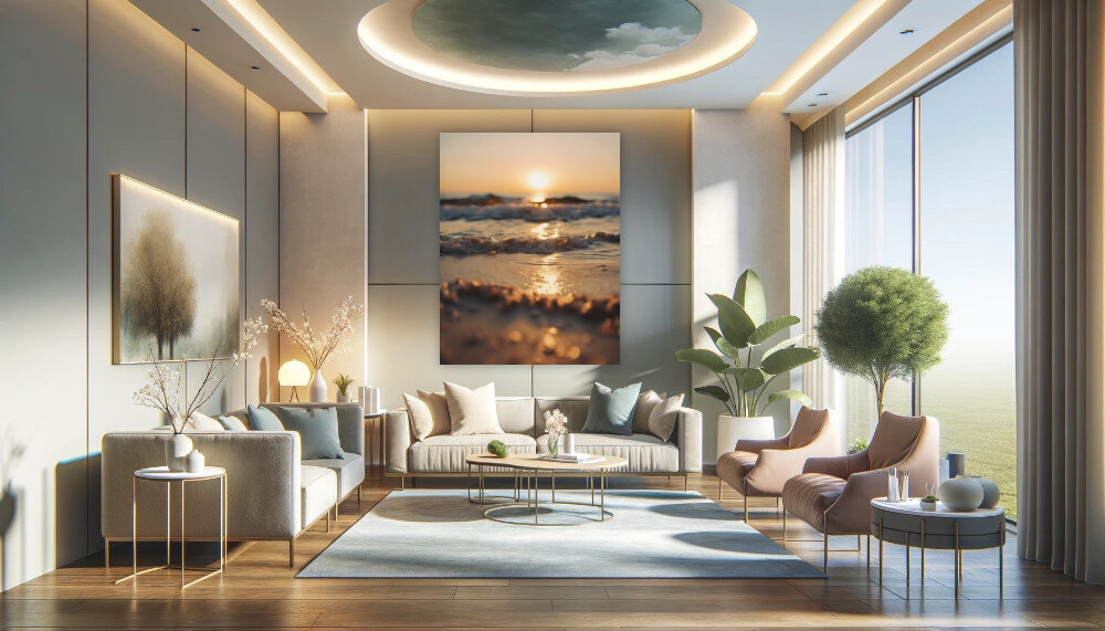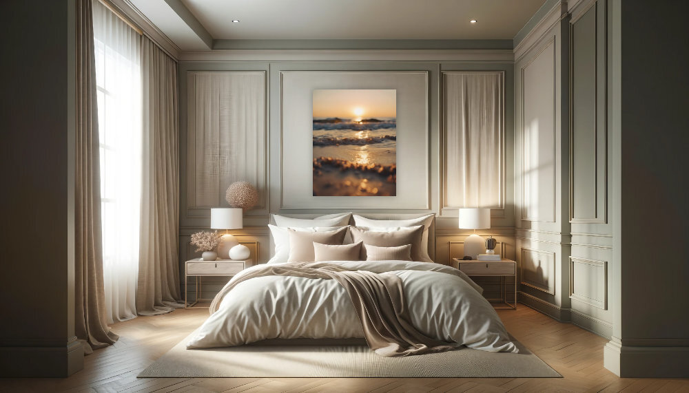 Tauche ein in das warme Glühen der 'Sonnenuntergang am Strand' Bilderserie. Jedes Kunstwerk fängt die unvergleichliche Stimmung eines am Horizont versinkenden Sonnenballs ein, während die letzten Strahlen den Himmel in ein malerisches Farbenspiel aus Orange, Rot und Gelb tauchen. Dieses Spektrum an lebendigen Farben, kombiniert mit der sanften Ruhe des Meeres und den zarten Konturen des Strandes, kreiert eine Atmosphäre von friedvoller Harmonie, die jedes Zuhause in eine Oase der Entspannung verwandelt.
