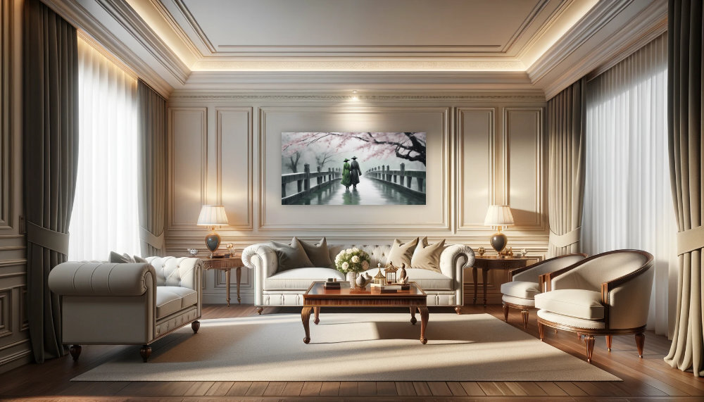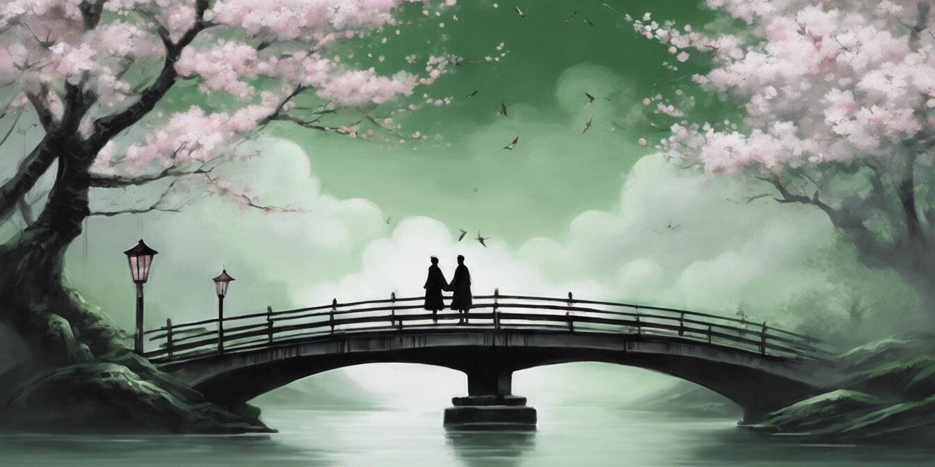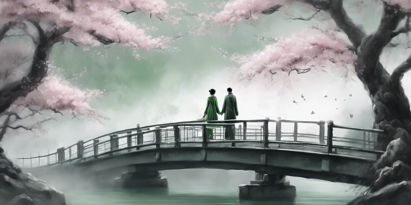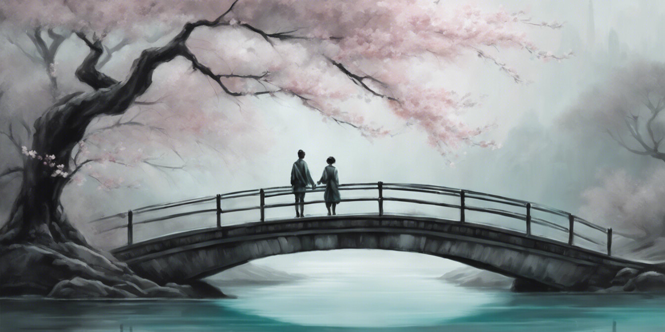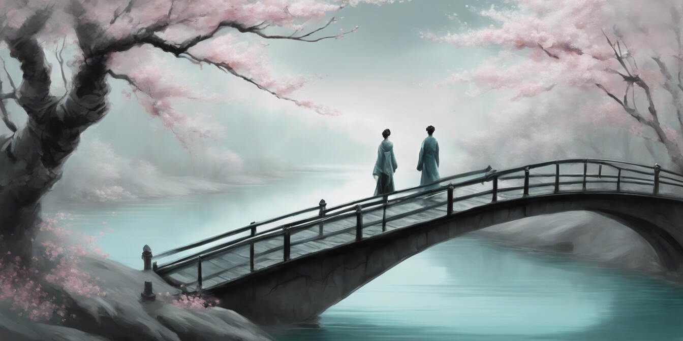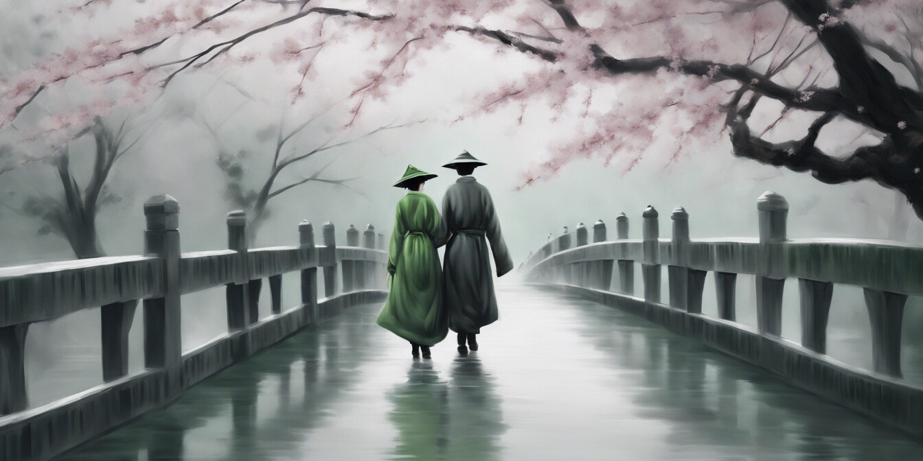 Eine faszinierende Darstellung zweier Personen in traditioneller asiatischer Kleidung, die gemeinsam einen Holzsteg entlangwandern. Die Szene wird durch die mystische Atmosphäre eines nebelverhangenen Tages unterstrichen, während zarte Kirschblüten einen Hauch von Farbe und vergänglicher Schönheit hinzufügen. Dieses Kunstwerk verbindet klassische Eleganz mit einem Gefühl der Ruhe und ist eine Hommage an die traditionelle asiatische Kultur und ihre Landschaften. Die harmonische Komposition macht dieses Bild zu einem idealen Akzent für jeden Raum, der Ruhe und künstlerische Tiefe ausstrahlen soll.