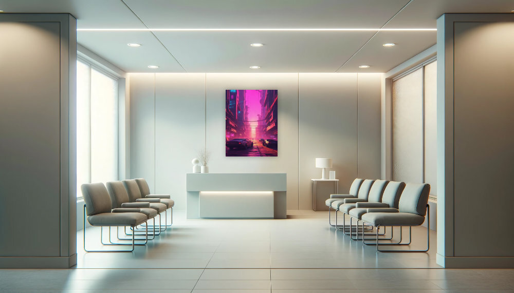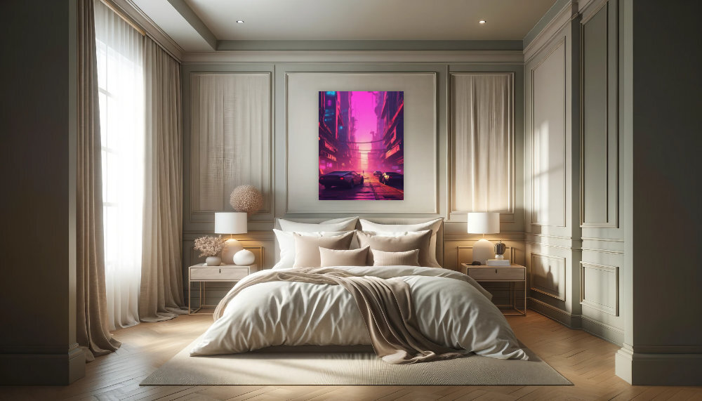 Tauche ein in die leuchtende Cyberpunk-Metropole, wo Neonlichter die Straße in ein pulsierendes Farbmeer aus Pink und Lila tauchen. Futuristische Fahrzeuge stehen bereit, um durch die schier unendlichen, hoch aufragenden Gebäude zu gleiten. Diese KI-generierte Kunst fängt die Essenz einer dystopischen Zukunft ein und verleiht jedem Raum eine tiefe, erzählerische Atmosphäre.
