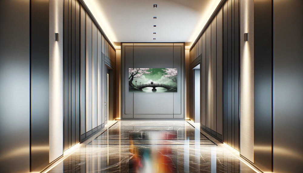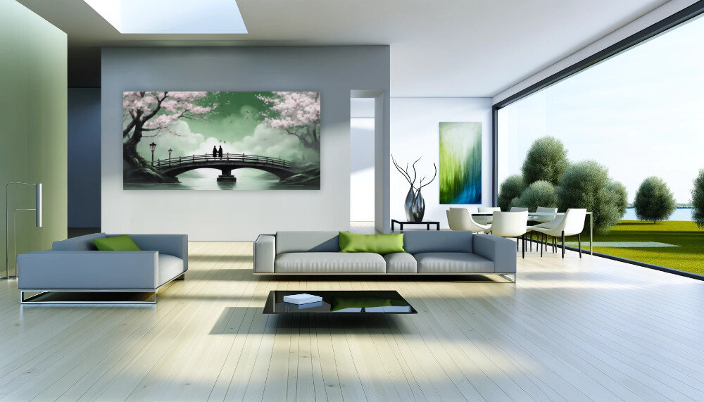 Diese kunstvolle Darstellung einer Brücke umgeben von blühenden Kirschbäumen und einer friedvollen Wasserlandschaft weckt Gefühle von Ruhe und Romantik. Zwei Personen stehen in der Mitte der Brücke, vielleicht in einem tiefen Gespräch oder einfach nur dabei, die Schönheit der Natur zu genießen. Die pastellfarbenen Blüten bilden einen sanften Kontrast zum satten Grün des Wassers und des Himmels. Dieses Bild lädt dazu ein, für einen Moment innezuhalten und die Stille und Schönheit des Augenblicks auf sich wirken zu lassen.