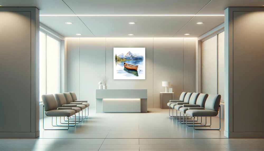 Erlebe die Ruhe und Gelassenheit eines einsamen Holzbootes auf einem friedlichen Bergsee, umrahmt von majestätischen Bergen und dichter Tannenwald-Kulisse. Dieses Bild fängt die Essenz der Natur ein und lädt Dich ein, für einen Moment der Stille innezuhalten. Perfekt für Dein Zuhause oder Büro, bringt dieses Kunstwerk eine erfrischende, friedliche Atmosphäre in jeden Raum.