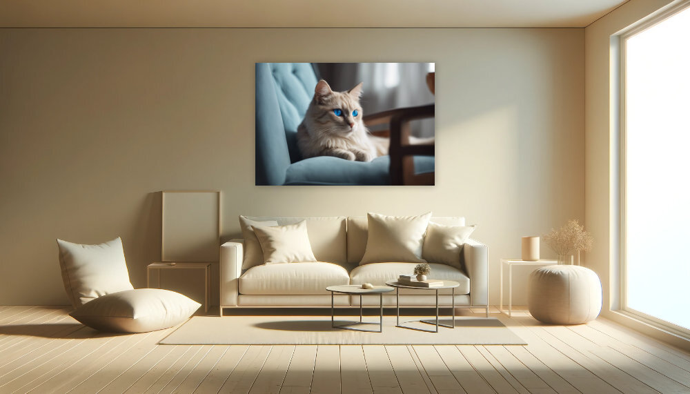 Tauche ein in die ruhigen Momente des Alltags mit diesem faszinierenden Kunstwerk, das eine elegante, cremefarbene Katze auf einem weichen, blauen Sessel zeigt. Ihre atemberaubenden, leuchtend blauen Augen fesseln den Betrachter und vermitteln eine Gefühlstiefe, die nur die naturgetreue Darstellung unserer KI-Kunst so einfangen kann. Dieses Bild ist die perfekte Ergänzung für jedes Zuhause oder Büro und lädt zur Entspannung und zum Innehalten ein. Bestelle dieses eindrucksvolle Stück noch heute und bereichere Deine Räumlichkeiten mit der Anmut und Gelassenheit, die von diesem Werk ausgeht.