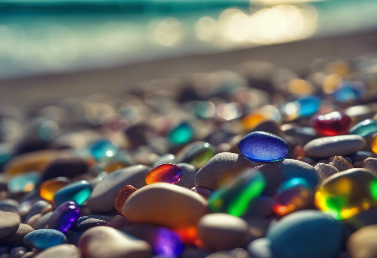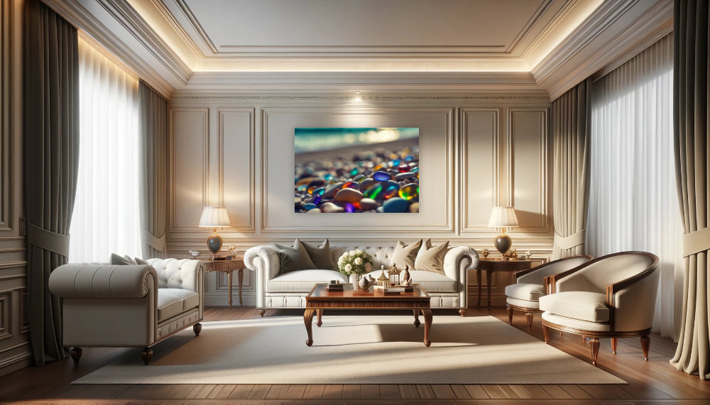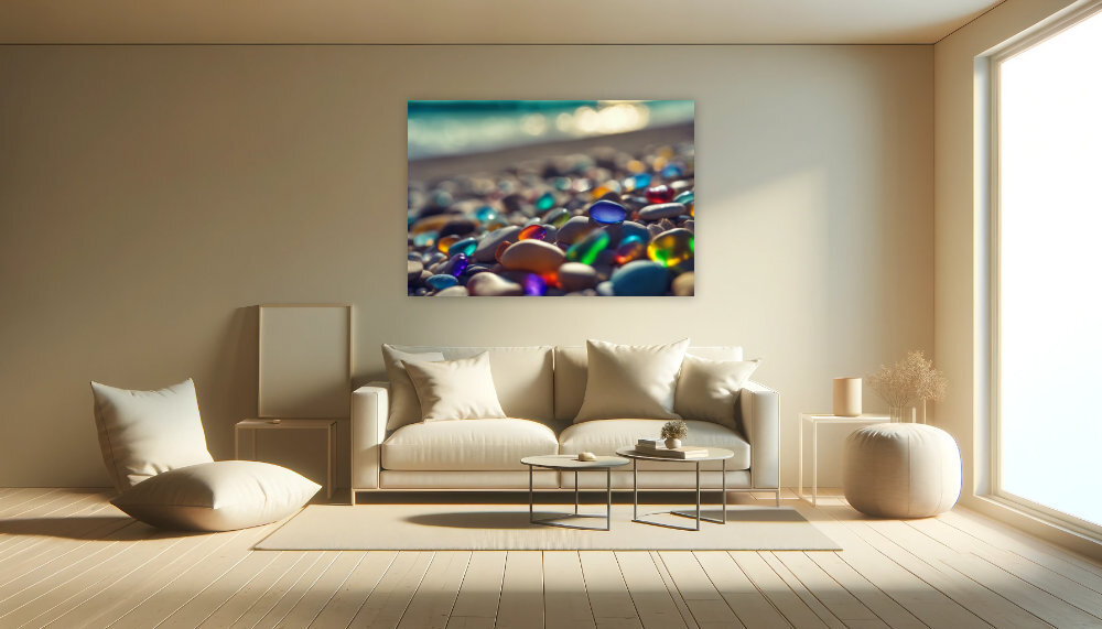 Bezaubernde Lichtreflexe tanzen auf einem Bett aus geschliffenen Steinen, die sich an einem ruhigen Strand befinden. Jeder Stein scheint seine eigene kleine Geschichte zu erzählen, eingefangen in dem kaleidoskopischen Spiel aus Licht und Farbe. Dieses faszinierende Bild fängt die Stille und Schönheit natürlicher Schätze ein und bringt die Lebendigkeit und den Glanz der Natur direkt zu dir nach Hause. Perfekt als Blickfang für jeden Raum, der eine beruhigende und zugleich belebende Note benötigt.