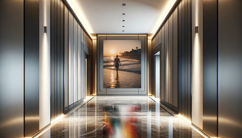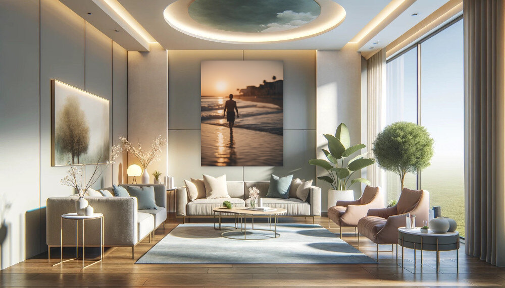 Tauche ein in das warme Glühen der 'Sonnenuntergang am Strand' Bilderserie. Jedes Kunstwerk fängt die unvergleichliche Stimmung eines am Horizont versinkenden Sonnenballs ein, während die letzten Strahlen den Himmel in ein malerisches Farbenspiel aus Orange, Rot und Gelb tauchen. Dieses Spektrum an lebendigen Farben, kombiniert mit der sanften Ruhe des Meeres und den zarten Konturen des Strandes, kreiert eine Atmosphäre von friedvoller Harmonie, die jedes Zuhause in eine Oase der Entspannung verwandelt.