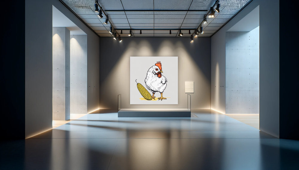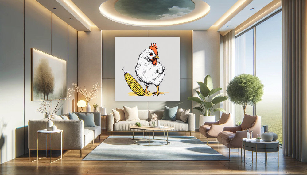 Dieses Kunstwerk fängt auf charmante Weise die ländliche Idylle ein. Ein stolzes weißes Huhn steht neben einem goldgelben Maiskolben – zwei Symbole der Naturverbundenheit und ländlichen Ernährung. Die Kombination aus detailreicher Federzeichnung und lebendigen Farben verleiht diesem Bild eine zeitlose Qualität, die sowohl moderne als auch traditionelle Innenräume bereichert. Ideal für Liebhaber des ländlichen Lebens oder als stilvolles Statement in einer ansonsten urbanen Umgebung.