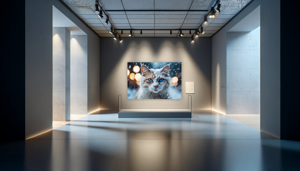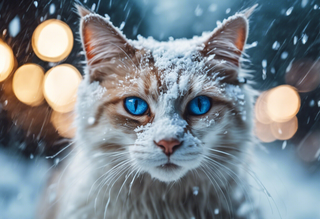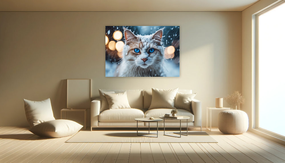 Entdecke die Schönheit der winterlichen Ruhe, eingefangen in den tiefblauen Augen dieser majestätischen Katze. Die samtigen Ohren tragen eine sanfte Schneedecke und die unscharfen Lichter im Hintergrund zaubern eine Atmosphäre vollkommener Stille und Frieden. Dieses exquisite Kunstwerk ist ein Tribut an die stille Pracht der kalten Jahreszeit und würde als hochwertiger Druck jede Wand verzaubern und jedem Raum einen Hauch von Winterwunder verleihen.